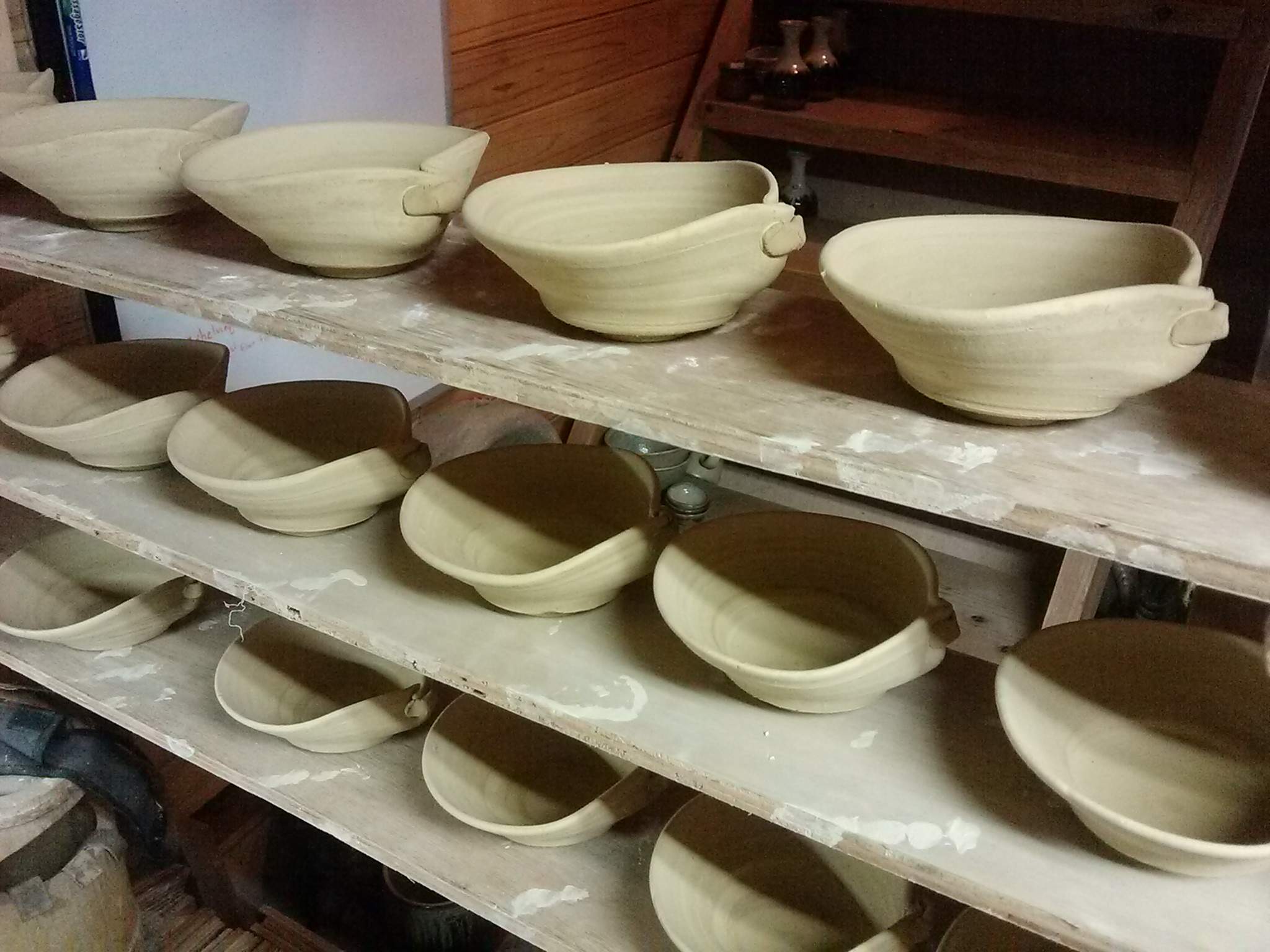 Now, I tried doing the bending and folding at various stages of drying and I’m here to tell you that it is best done when they are still sticky wet. I suppose it depends on your clay, but for the stuff we have around here, bending and folding is like asking for fate to show up in your studio with a big baseball bat.