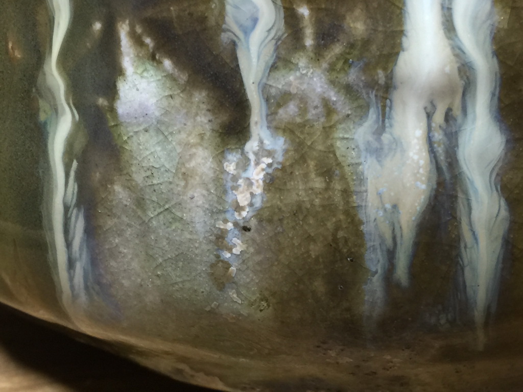 Upon unloading the kiln this morning, one thing was immediately apparent: the right side was far more reduced than the left. Yellower glazes and more slumping. Even on the left side there was some slumping, because of the excessive temp., and because of the clay which contained some low temp high iron clay to help seal the ware against leakage.