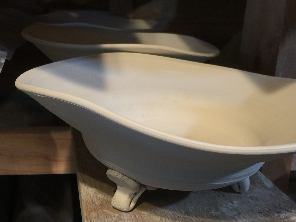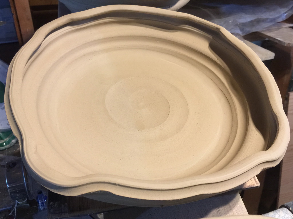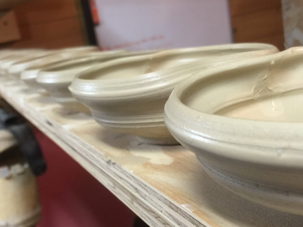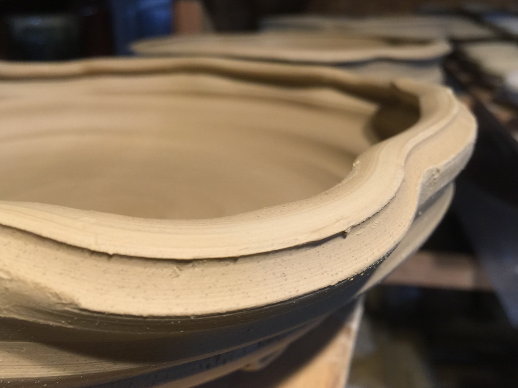 In prep for the spring firing of the wood kiln, I’ve started making work a little different that I have done before, more playing with rim shapes and putting feet on things. The larger platters are actually inspired by some old Shino and Karatsu pieces of similar shape. Almost everything pictured in this post is porcelain, either pretty white stuff, or ‘dirty’ having been run through my pugmill which contained red stoneware previously. I always hear how porcelain is so difficult to work with, but my experience is the opposite. It seems very forgiving compared to my usual short, large particle clay bodies.