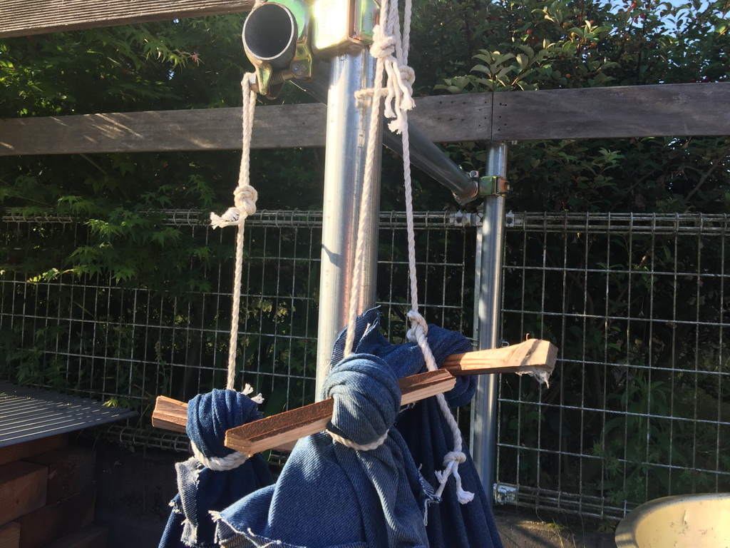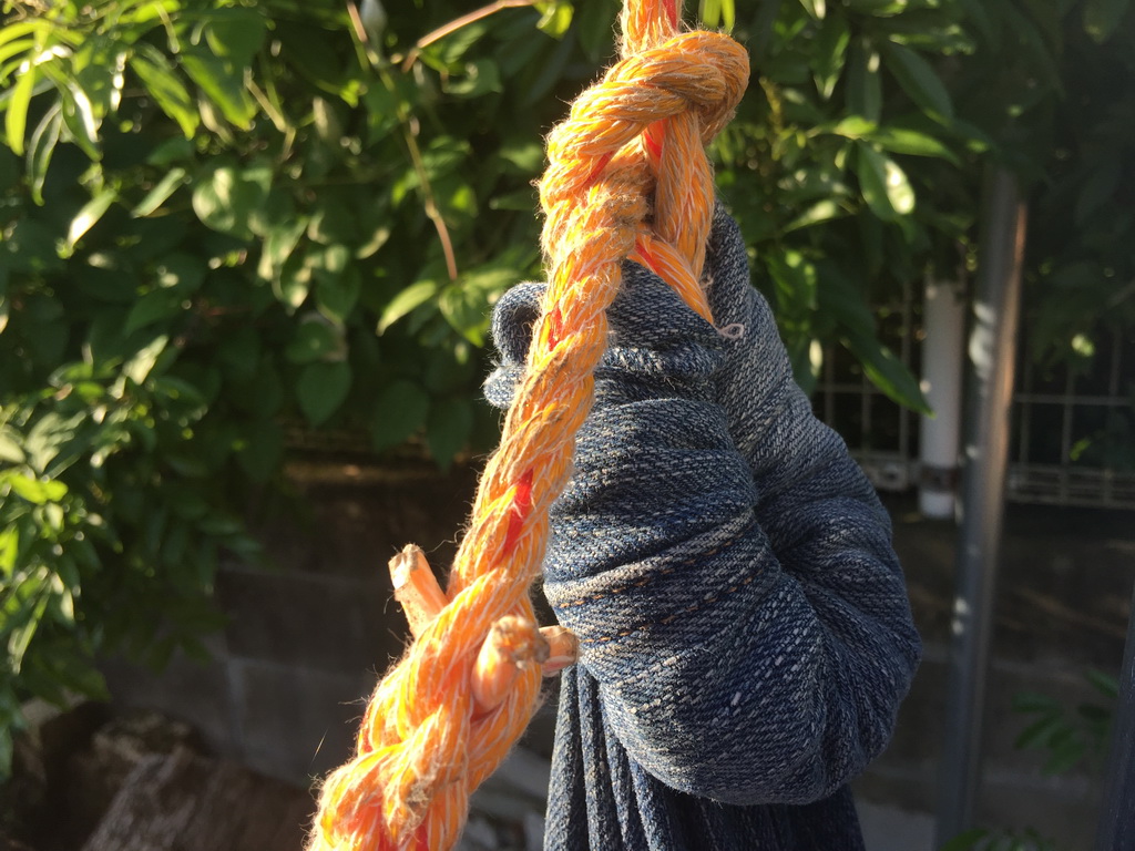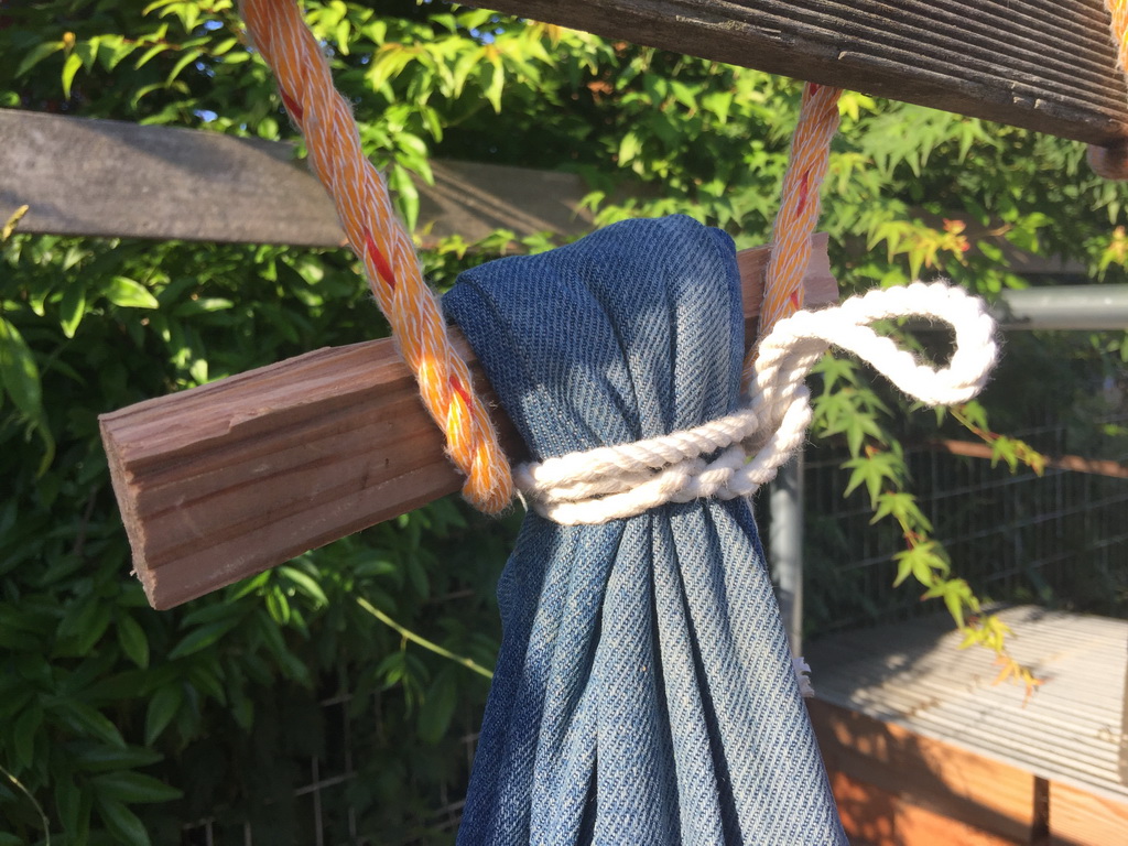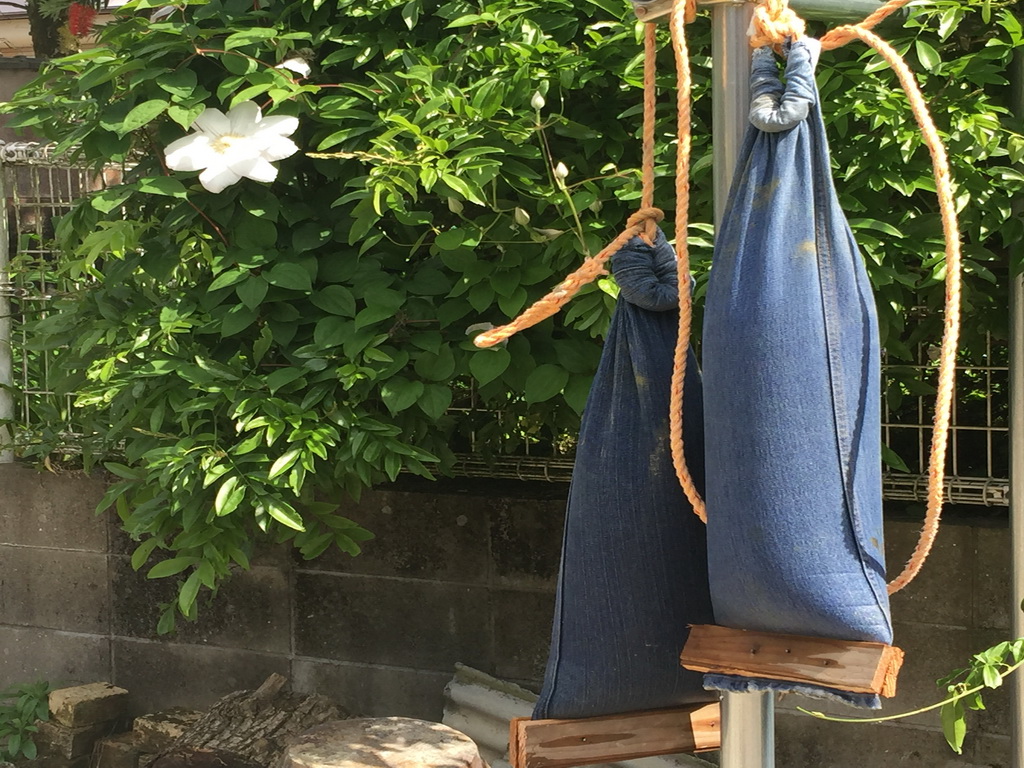 Once the legs were filled, tying them off was tricky because a leg full of clay slurry is FRICKIN HEAVY!!! First I tried rolling it down over the rope and tying, which works fine but is kind of tricky and if you don’t do it tightly, it unwinds and makes a mess. I found the best way was to twist the end and bend it over a stick, then bind it with rope. This way, you can use the stick as a handle to carry the leg which is very nice, and the stick can be used to hand the bag. The rope used to bind the end can also serve as a hanger. I hung up 12 of these yesterday, and am now waiting for them to firm up. I’m curious to see how long it will take.