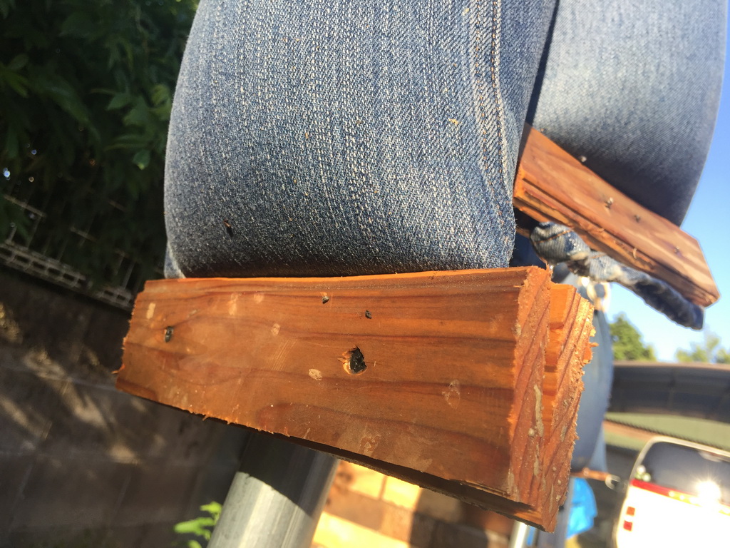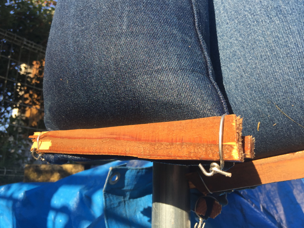 Since I have no space for a large clay drying platform, I’ve decided to try these pantlegs tied off, filled, and left to hang. Seems to be working so far, and I’m hoping to get a nice uniform sausage of clay with no dry edges. I tried a few methods to close the bottom. First, I tried sandwiching the pantleg between two pieces of wood and using screws to tighten them together. This worked, but left sharp screw ends, and when I dropped one full leg, the wood snapped and it opened up, spilling the clay. Plywood might prevent this. Being too lazy to get out the saw and cut more wood, I decided to split what I had into thinner pieces and wire them together to bind the folded over leg end. I tied them with wire and it seems to be working just dandy. Later, when I have time, I’ll try finding some sort of non rusting clamp device that can be applied and removed easily and quickly.