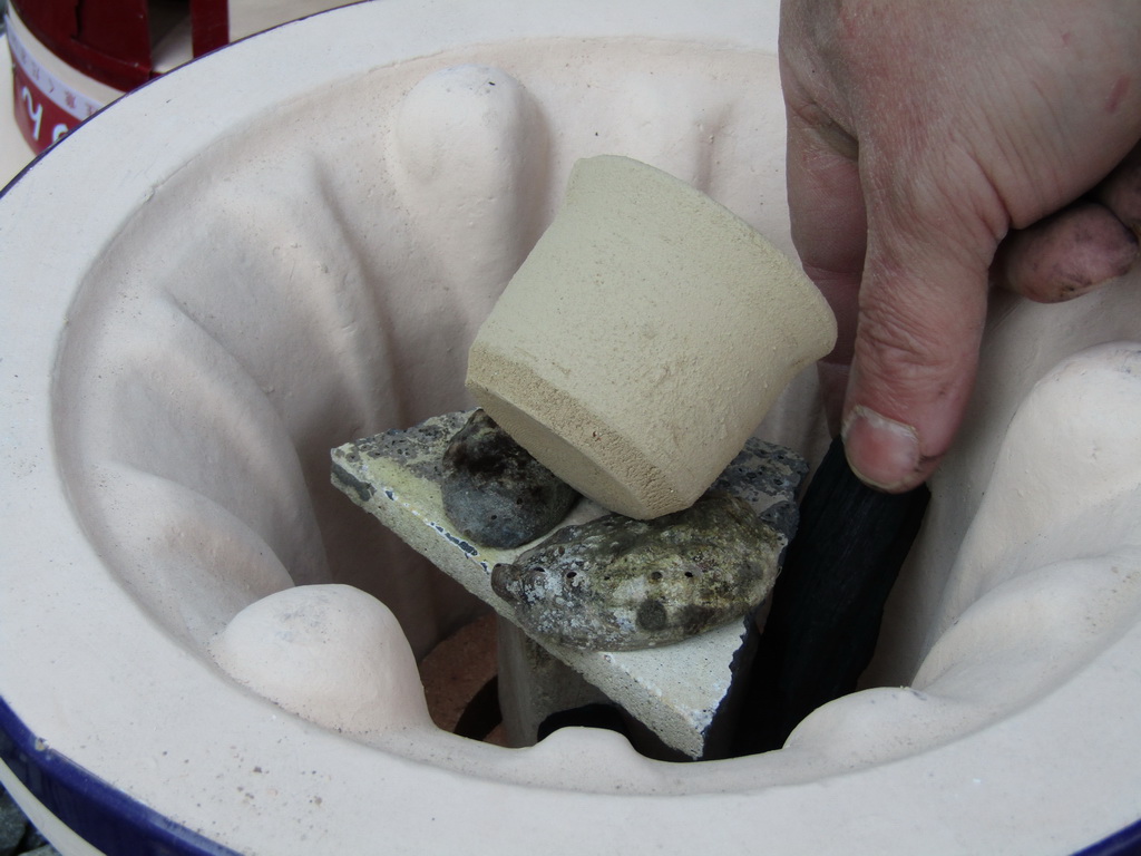 You start by packing some charcoal into the bottom of the chamber, around a stilt on which the pot will sit. Then place the pot on the stilt and continue covering with charcoal. Then place a coil of soft clay around the mouth of the shichirin, and overturn the second shichirin over it.