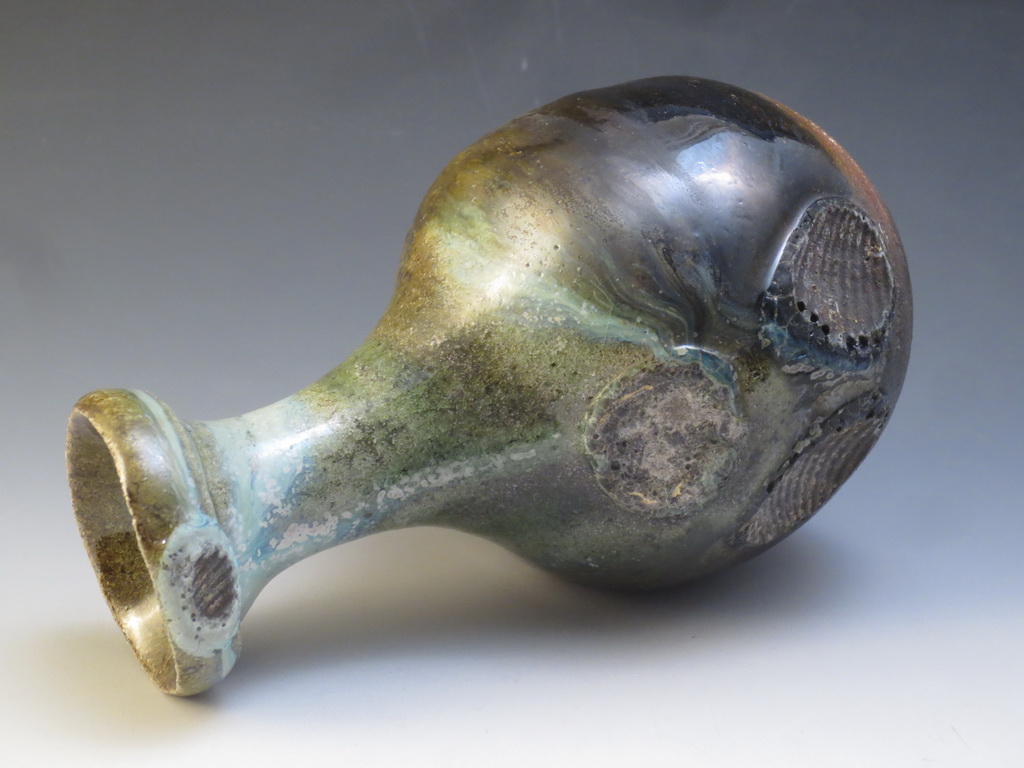 Upon unloading the kiln this morning, one thing was immediately apparent: the right side was far more reduced than the left. Yellower glazes and more slumping. Even on the left side there was some slumping, because of the excessive temp., and because of the clay which contained some low temp high iron clay to help seal the ware against leakage.