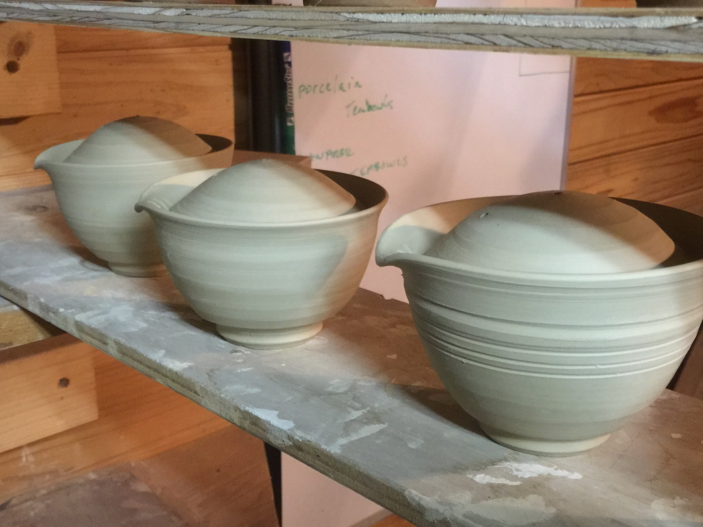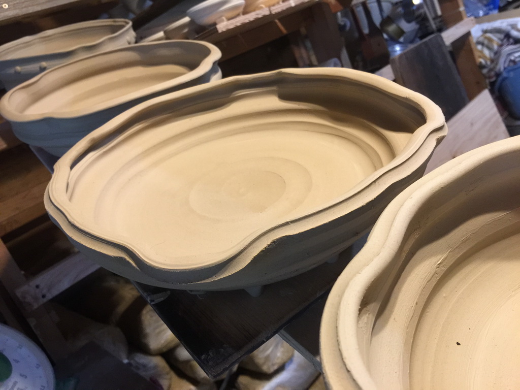 In prep for the spring firing of the wood kiln, I’ve started making work a little different that I have done before, more playing with rim shapes and putting feet on things. The larger platters are actually inspired by some old Shino and Karatsu pieces of similar shape. Almost everything pictured in this post is porcelain, either pretty white stuff, or ‘dirty’ having been run through my pugmill which contained red stoneware previously. I always hear how porcelain is so difficult to work with, but my experience is the opposite. It seems very forgiving compared to my usual short, large particle clay bodies.