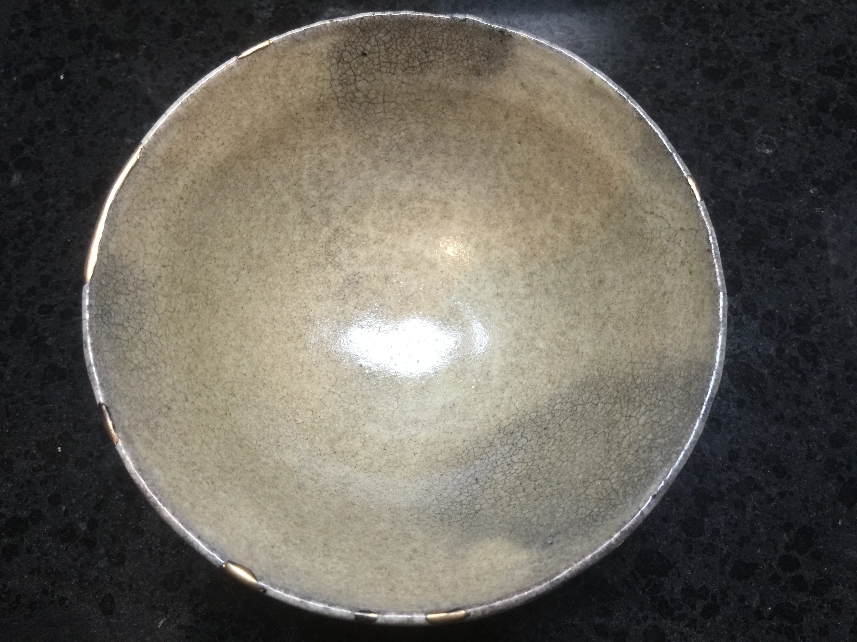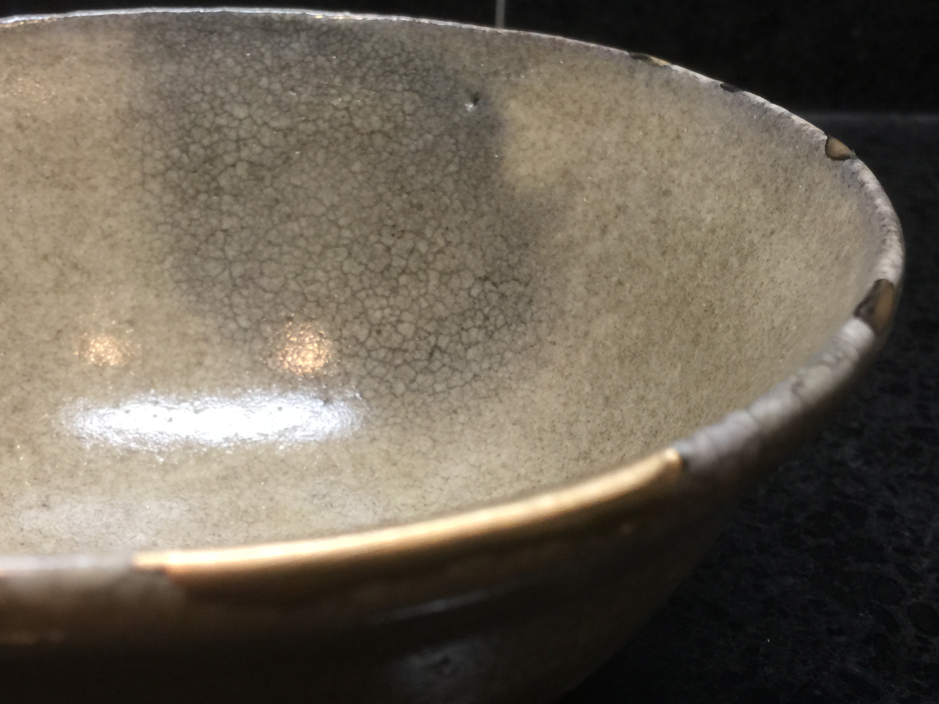 Because the body and the glaze were vitrified, but the white slip in between wasn’t, spots (where the slip was thickest) on the rim separated from the body and had to be restored with lacquer and gold (*1)