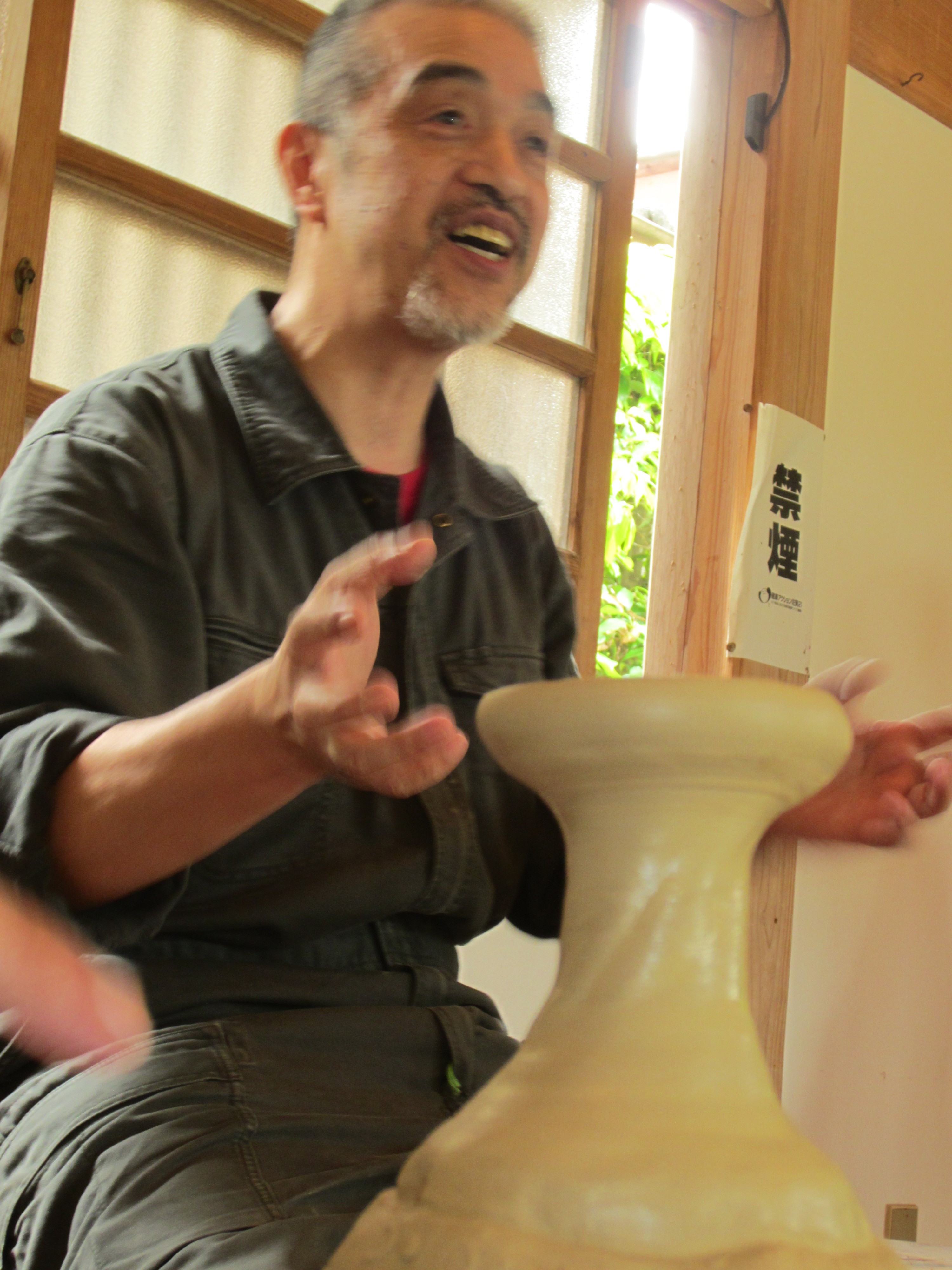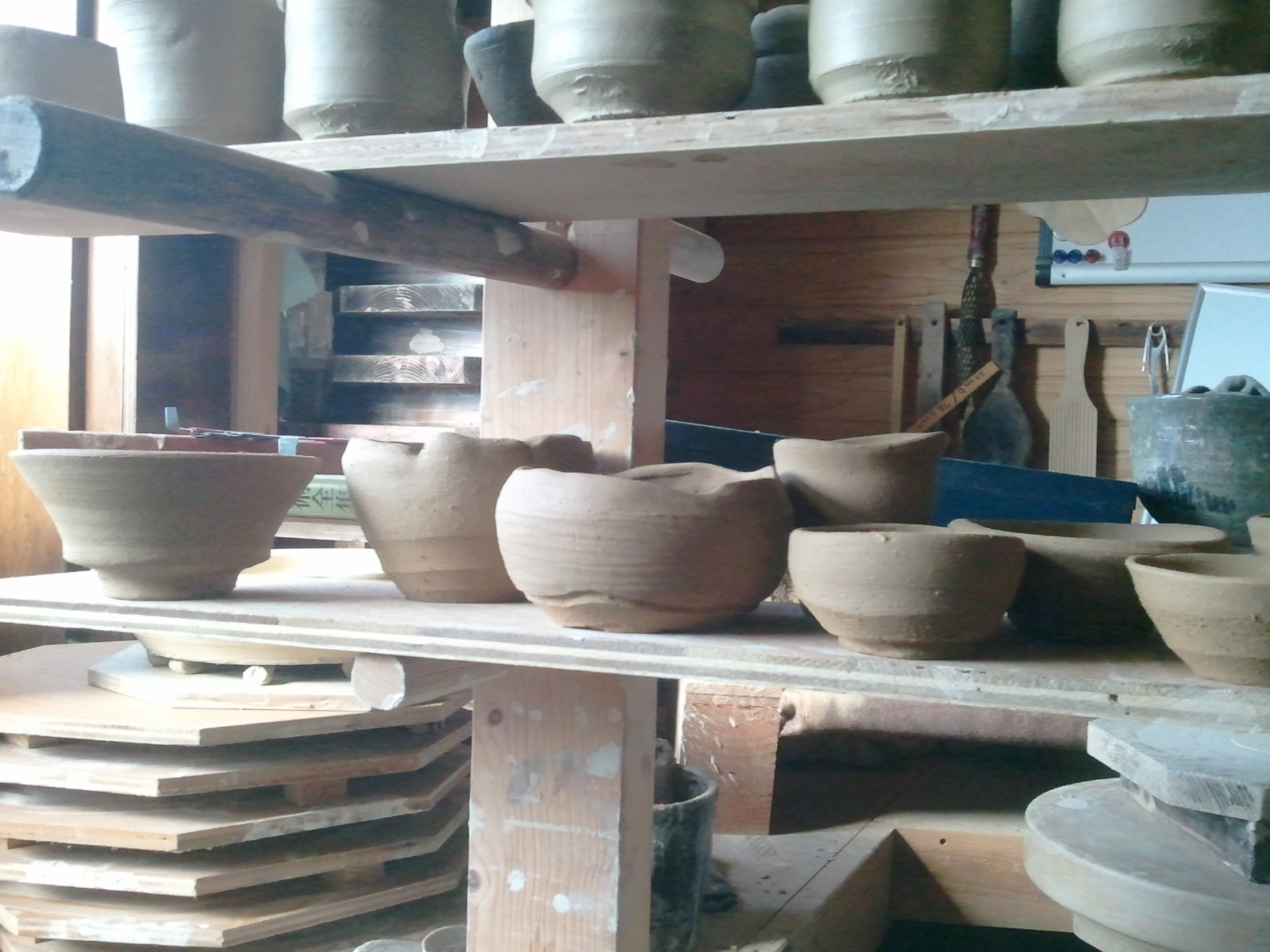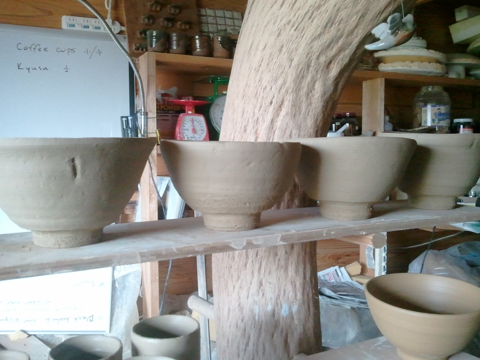 From the first refire load, my favorite pot is a porcelain teabowl glazed with rice straw ash glaze. I don’t normally work in porcelain, but in my search for bodies that vitrify a little better than the local clays, I’ve started using partly or mostly porcelain in some of my work. This particular bowl is porcelain with as much feldspar sandstone mixed in as I could manage, and still have it wedge-able.